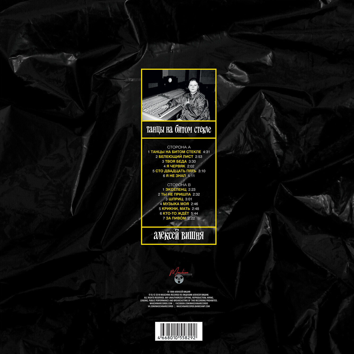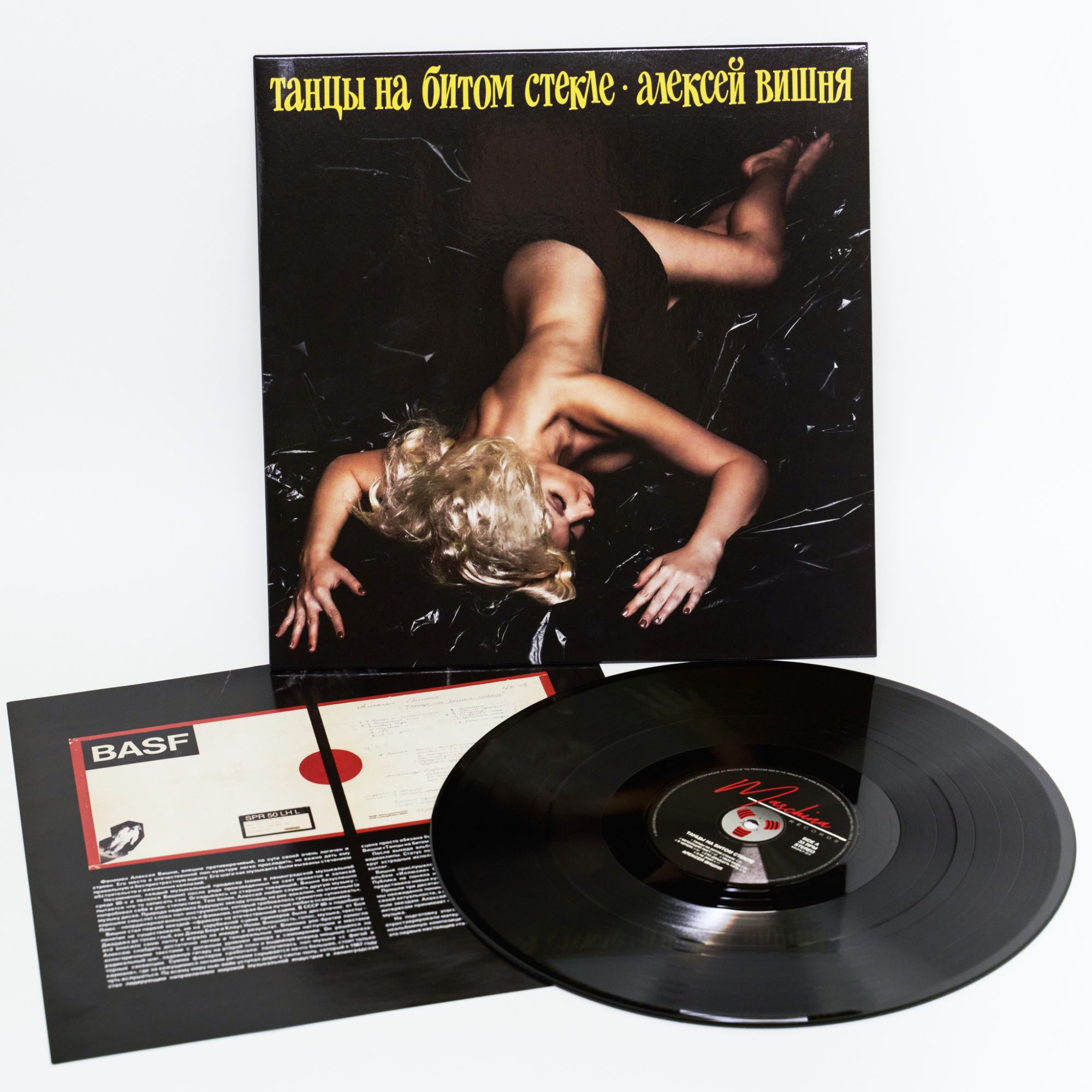 Maschina Records – MASHLP-024 LP, Album, Reissue, Remastered 2019 НОВЫЙ, В УПАКОВКЕ ПРОИЗВОДИТЕЛЯ 1. Танцы На Битом Стекле 2. Белеющий Лист 3. Твоя Беда 4. Я - Червяк 5. Сто Двадцать Пять 6. Я Не Знал 7. Экселенц 8. Ты Не Пришла 9. Шприц 10. Музыка Моя 11. Крикни, Мать 12. Кто-то Ждёт Bonus Tracks 13. За Пивом Музыкальное издательство Maschina Records представляет культовый синти-поп-альбом Алексея Вишни «Танцы на битом стекле». Альбом был записан в 1989 году в Ленинграде на домашней студии музыканта «Яншива Шела». При записи альбома использовались только синтезаторы. Саркастические тексты и характерный вокал Вишни вызывали у слушателей ассоциации как с экспериментами Клауса Номи, так и со стилистикой «Ласкового Мая». Тем не менее, альбом сразу полюбился слушателям и спустя некоторое время был издан фирмой «Мелодия» небольшим тиражом на пластинке. Первая и единственная (до этого момента) версия содержала традиционный набор дефектов: несовпадение головок воспроизведения студийного магнитофона с магнитофоном Алексея Вишни (из-за чего пластинка стала звучать глухо), несовпадение скоростей и т.д. В результате выпущенная пластинка не отражала реального качества записи альбома, но даже при всех минусах сейчас это издание является филофонической редкостью. Новое издание от Maschina Records выполнено с использованием оригинальной мастер-ленты из архива Алексея Вишни. Фонограмма была отреставрирована, сделан корректный мастеринг в соответствии с современными техническими требованиями и музыкальной стилистикой альбома. В оформление включены архивные фото и история создания альбома. К каноническому трек-листу «Танцев на битом стекле» добавлена ранее официально неизданная песня «За пиво́м», созданная в тот же период творчества Вишни. ________________________________________________________