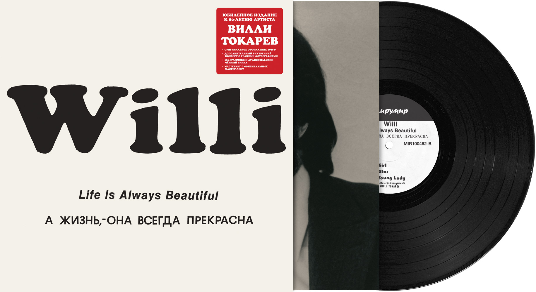 Сторона 1: 1.Карусель любви 2.А жизнь – она всегда прекрасна 3.Зачем 4. Тамара 5.Sunny, Sunny Сторона 2: 1.Поцелуй 2.Дождь 3.Солнечная девушка 4.Счастливая звезда 5.Милая девушка ************************************************************************************************** В 2014 году Вилли Токарев отметил двойной юбилей – своё 80-летие и 35-летие выпуска первого альбома «А жизнь, она всегда прекрасна». Эти юбилеи - прекрасный повод вспомнить, с чего началась сольная карьера одного из знаковых российских артистов 80-х. К этим событиям приурочен выпуск точной копии его первого альбома «А жизнь, - она всегда прекрасна», выпущенного в США в 1979 году и давно ставшего коллекционной редкостью. Вилли Токарев, как настоящий большой артист, сохранил оригинальные ленты, с которых звукоинженер Евгений Гапеев кропотливо восстанавливал фонограмму для выпуска на виниле. Можно смело сказать, что новое издание, лишенное многочисленных дефектов оригинальной записи (таких, как щелчки, провалы, перекосы по частотам), звучит куда лучше оригинальной пластинки. И совсем скоро вы сами сможете убедиться в этом. Дополнительно к изданию прилагается внутренний конверт с умопомрачительными фотографиями из личного архива Вилли Токарева.