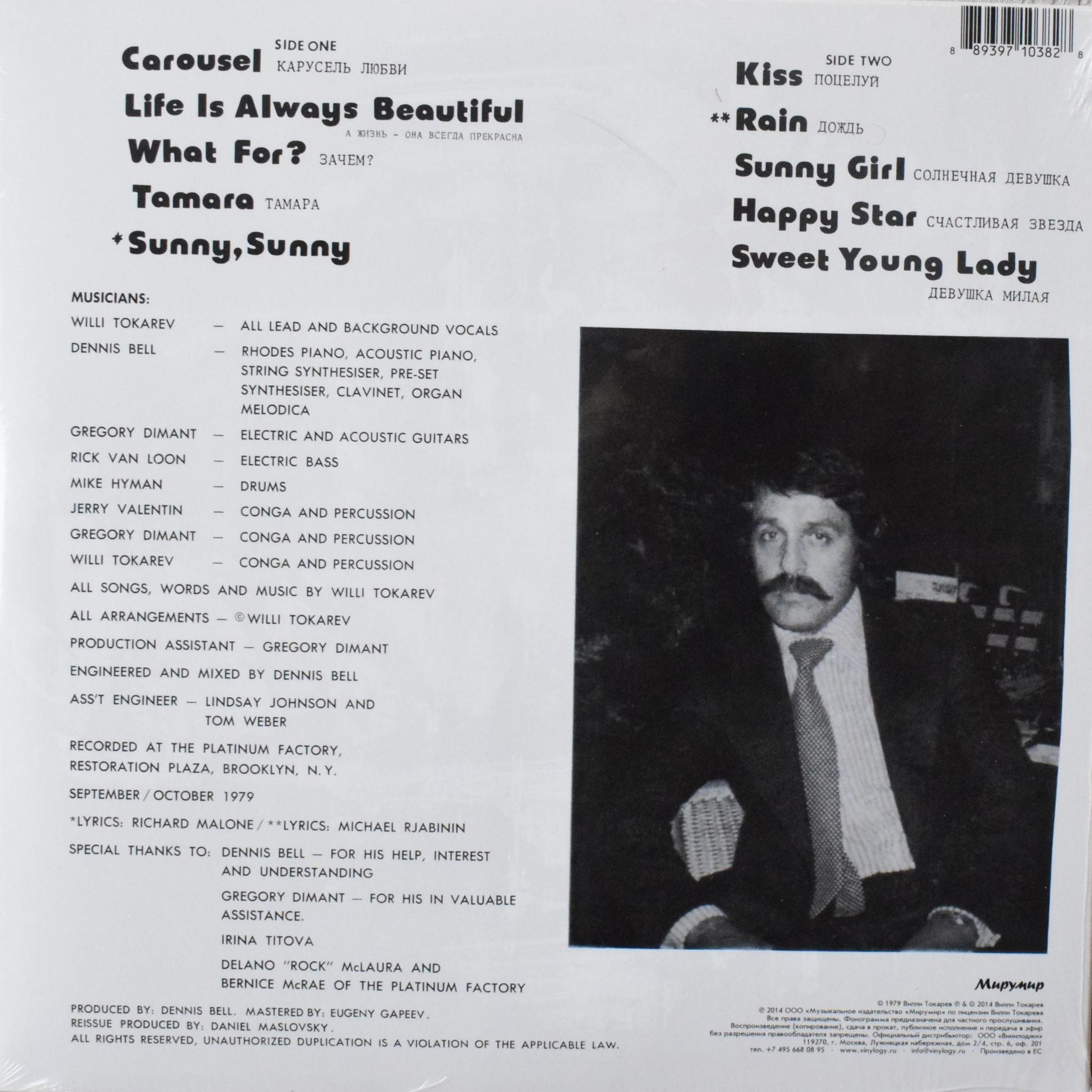 Сторона 1: 1.Карусель любви 2.А жизнь – она всегда прекрасна 3.Зачем 4. Тамара 5.Sunny, Sunny Сторона 2: 1.Поцелуй 2.Дождь 3.Солнечная девушка 4.Счастливая звезда 5.Милая девушка ************************************************************************************************** В 2014 году Вилли Токарев отметил двойной юбилей – своё 80-летие и 35-летие выпуска первого альбома «А жизнь, она всегда прекрасна». Эти юбилеи - прекрасный повод вспомнить, с чего началась сольная карьера одного из знаковых российских артистов 80-х. К этим событиям приурочен выпуск точной копии его первого альбома «А жизнь, - она всегда прекрасна», выпущенного в США в 1979 году и давно ставшего коллекционной редкостью. Вилли Токарев, как настоящий большой артист, сохранил оригинальные ленты, с которых звукоинженер Евгений Гапеев кропотливо восстанавливал фонограмму для выпуска на виниле. Можно смело сказать, что новое издание, лишенное многочисленных дефектов оригинальной записи (таких, как щелчки, провалы, перекосы по частотам), звучит куда лучше оригинальной пластинки. И совсем скоро вы сами сможете убедиться в этом. Дополнительно к изданию прилагается внутренний конверт с умопомрачительными фотографиями из личного архива Вилли Токарева.