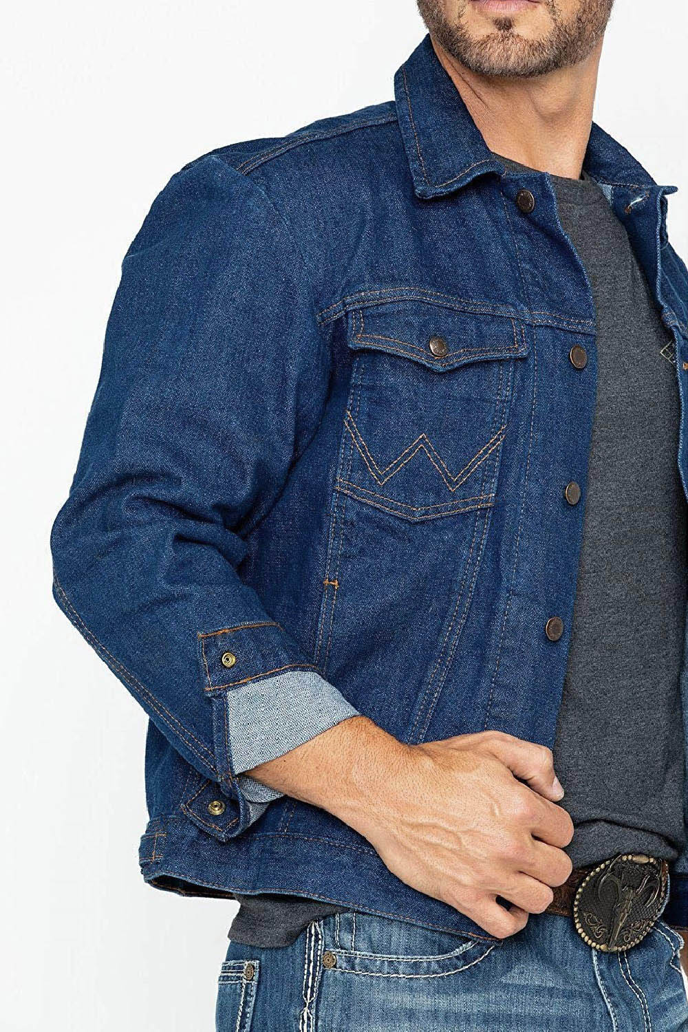Куртка выполнена в удобном для каждодневной носки крое. Имеет прочную армированную конструкцию. Имеются два нагрудных кармана на пуговицах и два боковых врезных кармана. Мужская джинсовая куртка Wrangler 74145PW Cowboy Cut® Original Jacket прямого кроя. Изготовлена из материала высокого качества с использованием технологии Broken Twill — особое плетение ткани в виде ёлочки. В процессе носки не растягивается, после стирки не усаживается. Цвет синий. Вид застежки болты. Четыре внешних кармана и два внутренних. Состав 100% хлопок. Cделанная для внутреннего рынка США. Цвет: Denim Крой: прямой,классический четырехкарманный крой Состав ткани: 100% Cotton, Broken Twill Denim 14.75 oz. Застежка: пуговицы Подкладка: без подкладки Страна бренда: США Размещение производства: Мексика