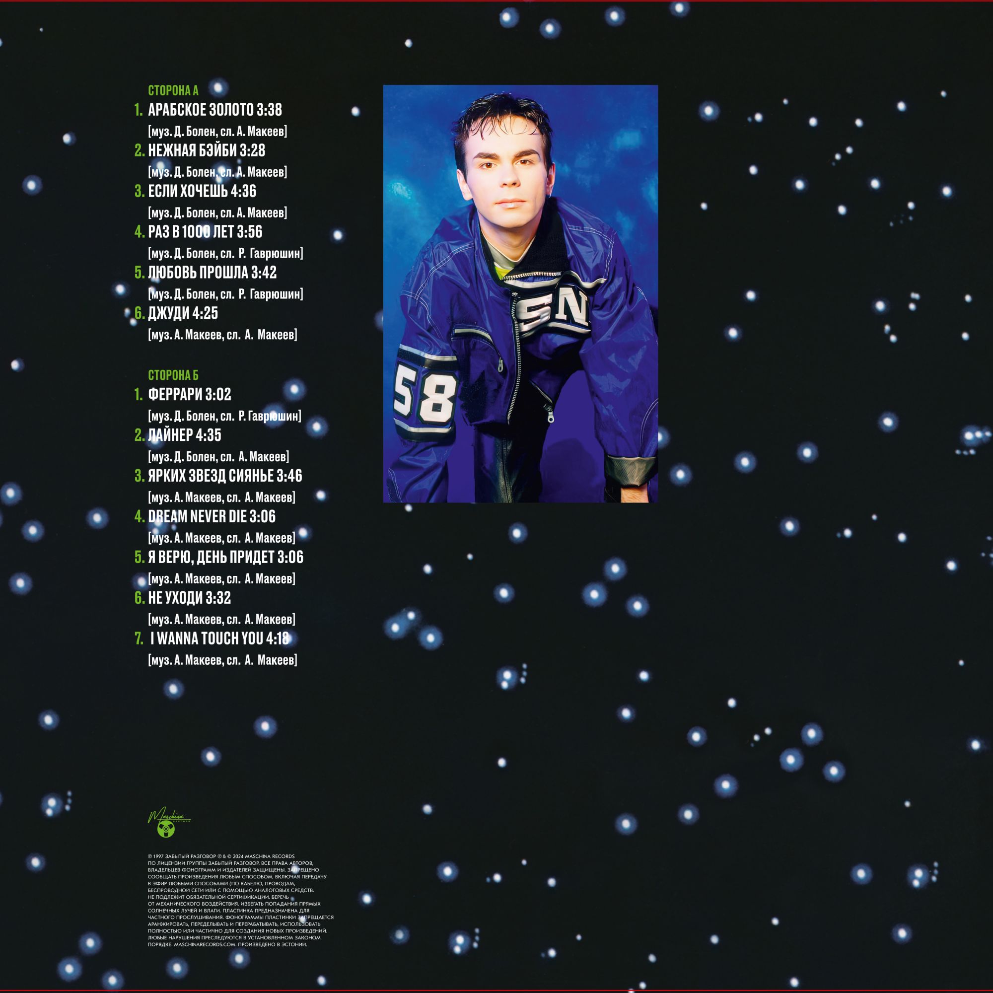 Maschina Records – MASHLP-253 Vinyl, LP, Compilation Estonia НОВЫЙ, В УПАКОВКЕ ПРОИЗВОДИТЕЛЯ 1. Арабское Золото 2. Нежная Бэйби 3. Если Хочешь 4. Раз В 1000 Лет 5. Любовь Прошла 6. Джуди 1. Феррари 2. Лайнер 3. Ярких Звезд Сияние 4. Dream Never Die 5. Я Верю, День Придет 6. Не Уходи 7. I Wanna Touch You Дебютный альбом «русских Modern Talking» состоит из 13 композиций. Часть из них представляет собой русскоязычные версии и интерпретации громких шлягеров Дитера Болена из репертуара известного немецкого поп-дуэта. Остальные песни — это авторские творения Антона Макеева, сочинённые в той же стилистике. Один из главных хитов пластинки — трек «Арабское золото», который в начале 90-х звучал на всех радиостанциях. ________________________________________________________
