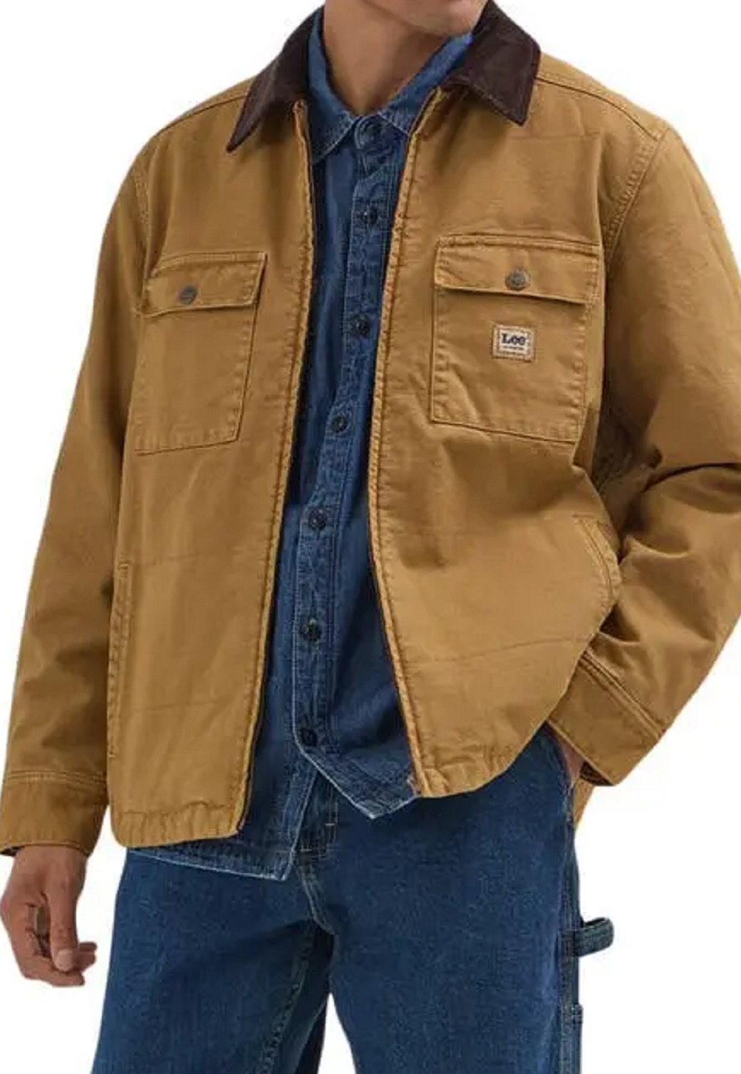 имеет легкий утеплитель и вельветовый воротник, что создает классический рабочий образ. Застежка-молния спереди.