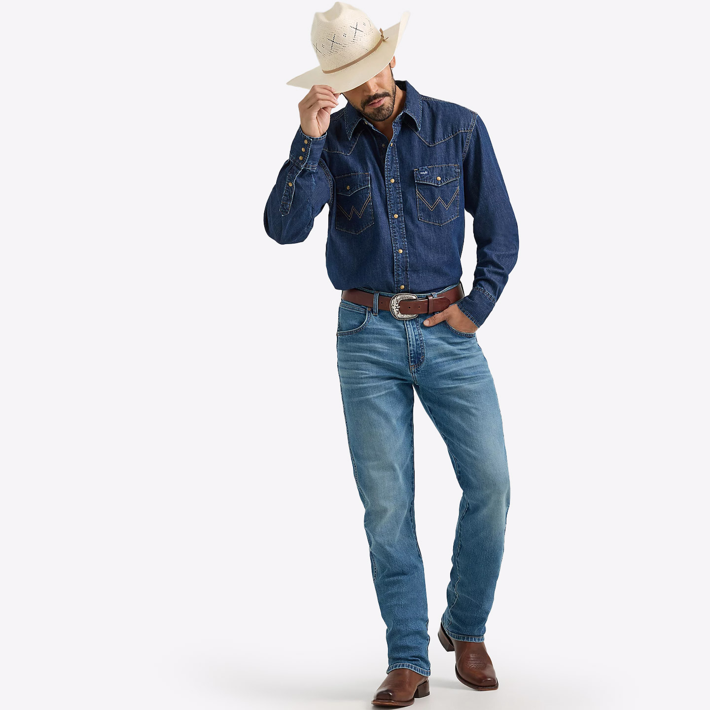 например, застежки-кнопки на жемчужины, вышитые карманы «W» и нашивка Wrangler на нагрудном кармане.