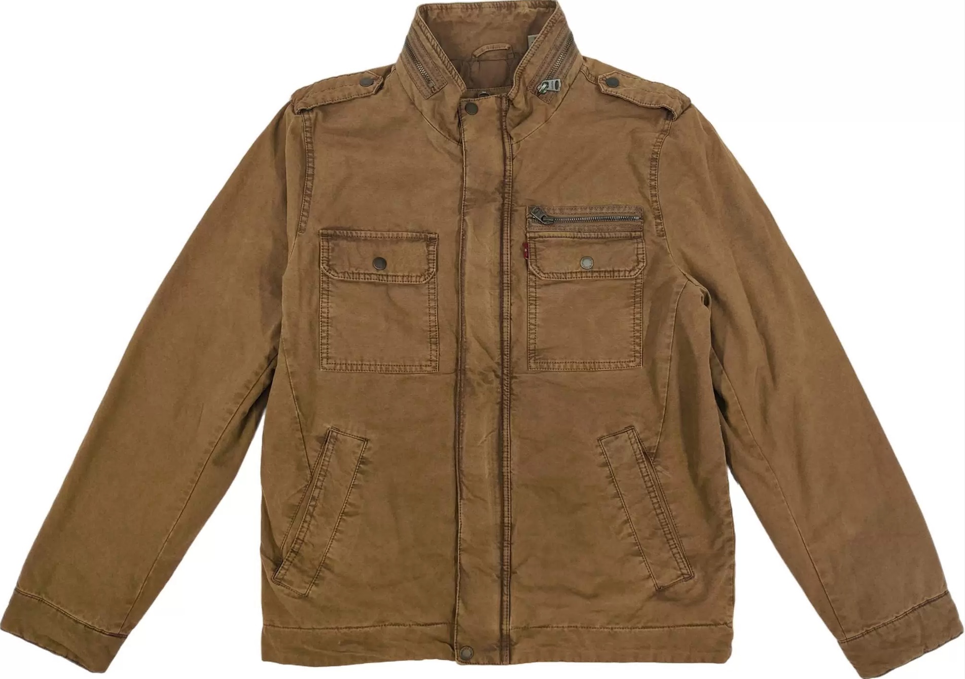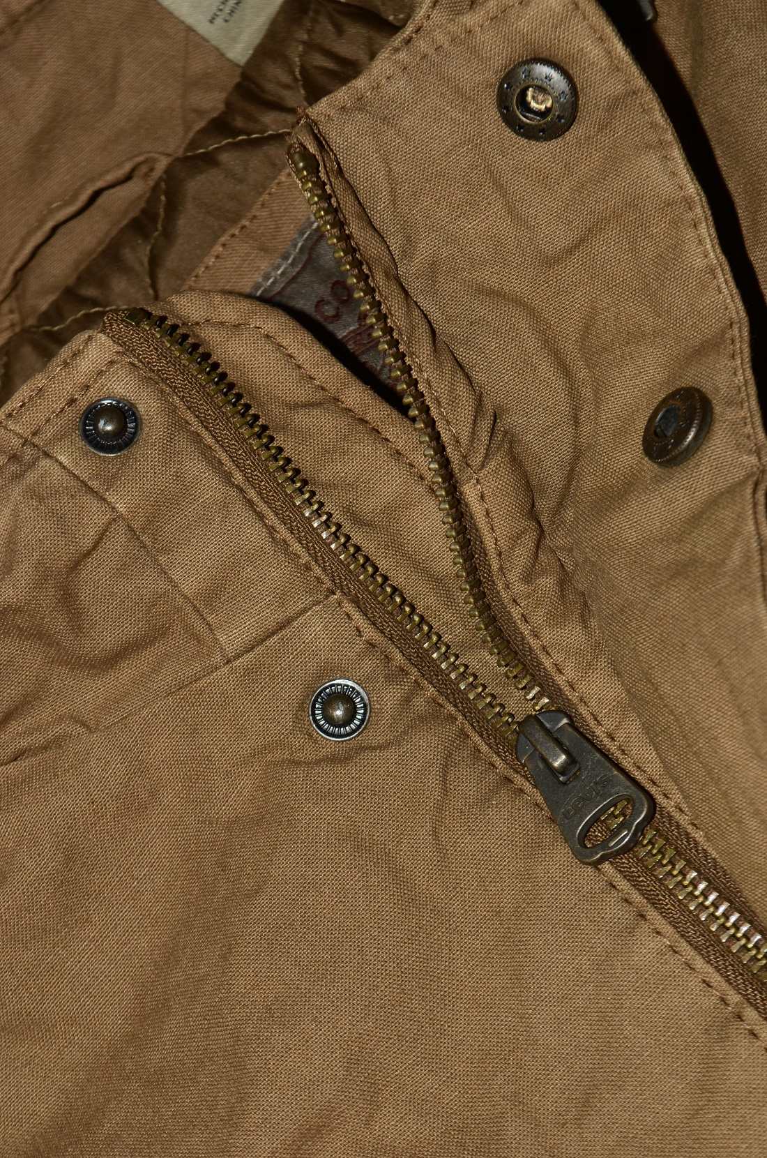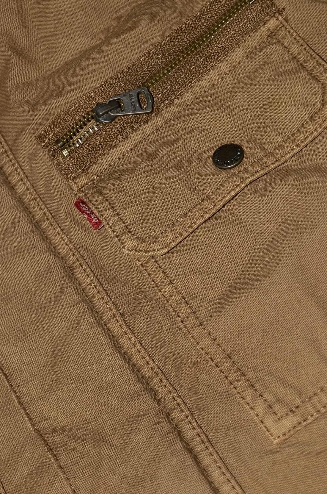 Два нагрудных кармана с клапанами на кнопках, один прорезной карман на молнии над левым нагрудным карманом, два нижних прорезных кармана и один внутренний прорезной карман. Центральная передняя планка со скрытой застежкой-молнией и кнопкой, а также открытая молния на воротнике. Регулируемые манжеты на кнопках и погоны на плечах Красный язычок Levi's на левом нагрудном кармане. Карманы: пять наружных , один внутренний Застежки: молния, клепки Крой: прямой Состав ткани: 100%хлопок / 100%полиэстер Страна бренда: США Размещение производства: КНР