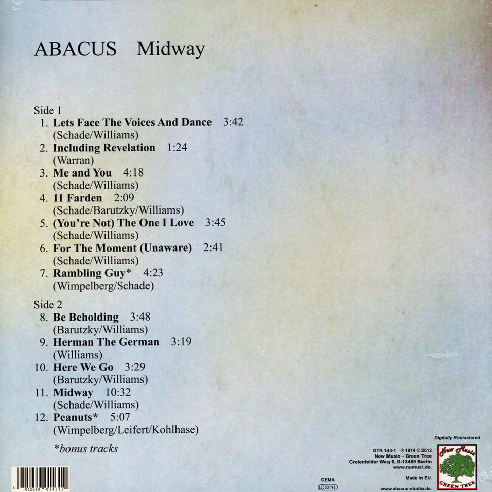 БЕЗОПАСНАЯ ОПЛАТА НА САЙТЕ В нашем магазине Вы можете оплатить свой заказ платежной картой Visa, Mastercard или МИР. После успешной оплаты Вы получите электронный чек. Информация, указанная на чеке, содержит все данные о проведенной операции оплаты. Данные Вашей платежной карты гарантировано защищены в соответствии со стандартами безопасности PCI DSS. Товар отправляем в надежной упаковке, все отправления застрахованы Внимание: Как и все продавцы изданий на виниле, мы пользуемся международно признанными условиями для частной продажи оригинально запечатанных пластинок. Ввиду невозможности контроля, нет гарантии на дефекты и производственный брак. Мы не принимаем никаких претензий, не делаем возвратов и каких-либо компенсаций. При покупке учитывайте это. Доставка Сумма доставки рассчитывается индивидуально, по тарифам СДЭК и ПОЧТЫ РОССИИ после оформления Вами заказа. На сайте могут быть использованы каталожные фото товара, Реальные фото товара по запросу (при покупке товара). Характеристики Abacus - Midway 1973
