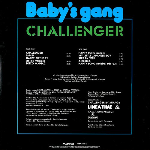 Первый и единственный альбом диско-проекта Baby’s Gang – одна из наиболее котируемых позиций среди коллекционеров итало-диско. Пластинка в какой-то степени стала прообразом «Ласкового Мая», только вместо русских мальчишек-детдомовцев все вокальные партии были исполнены итальянскими девочками-школьницами. Первый хит коллектива “Happy Song” появился в 1983 году и настолько понравился продюсеру Boney M Франку Фариану, что кавер-версия в исполнении Boney М попала на пластинку “Kalimba De Luna”. На появившемся пару лет спустя полноценном альбоме была целая россыпь хитов. Спустя пару лет последовало продолжение: последним синглом стал хит “Disco Maniac”, после чего творческая активность проекта закончилась. Помимо нового мастеринга и качественной полиграфии, включает в себя два дополнительных трека, которых не было на оригинальном альбоме: оригинальную версию “Happy Song” (напомним, что в альбоме выходил ремикс 1985 года) и макси-версию “Disco Maniac”. ________________________________________________________