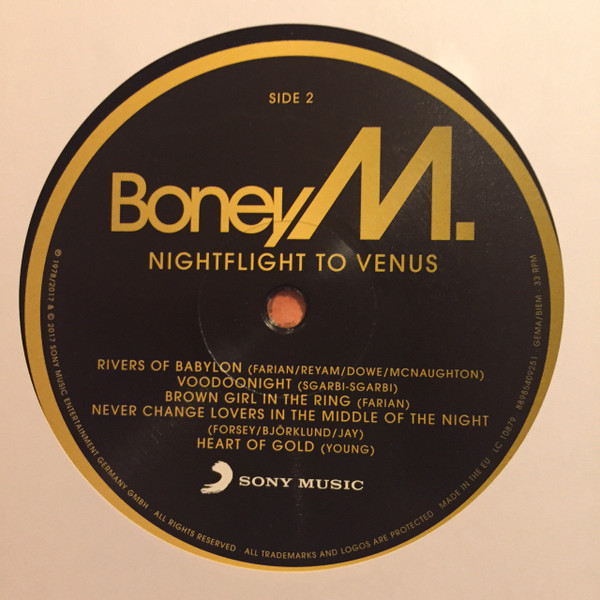 Sony Music – 88985409251 LP, Album, Reissue, Remastered Europe 2017 Выпущено в стандартном конверте.Высококачественная мастеринг-запись с оригинального источника. НОВЫЙ, В УПАКОВКЕ ПРОИЗВОДИТЕЛЯ A1. Nightflight To Venus A2. Rasputin A3. Painter Man A4. He Was A Steppenwolf A5. King Of The Road B1. Rivers Of Babylon B2. Voodoonight B3. Brown Girl In The Ring B4. Never Change Lovers In The Middle Of The Night B5. Heart Of Gold Nightflight to Venus («Ночной полёт на Венеру») — третий студийный альбом группы Boney M., спродюсированный Фрэнком Фарианом. Nightflight to Venus считается наиболее успешным альбомом группы, как в коммерческом, так и в творческом плане. Отдельные его композиции, в частности «Rasputin», «Rivers of Babylon», «Brown Girl in the Ring» были выпущены как синглы. Альбом был в целом положительно оценён критикой и считается классическим для поп-музыки и направления евродиско 1970-х годов. ________________________________________________________