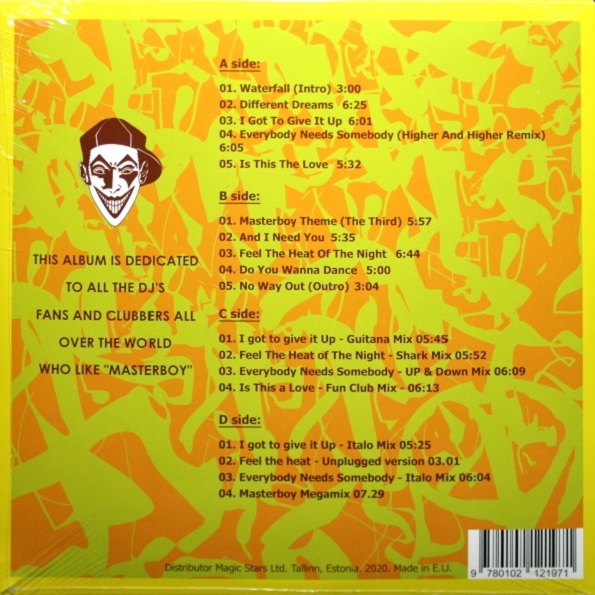 Описание Masterboy - Different Dreams - 1994Masterboy - Different Dreams 1994 (переиздание 2021, тираж 150 копий) 2LP Estonia Coloured Vinyl Maschina Records, Magic Stars Ltd. BSTARS012 НОВЫЙ, В УПАКОВКЕ ПРОИЗВОДИТЕЛЯ A1 Waterfall (Intro) 3:00 A2 Different Dreams 6:25 A3 I Got To Give It Up 6:01 A4 Everybody Needs Somebody (Higher And Higher Remix) 6:25 A5 Is This The Love 5:32 B1 Masterboy Theme (The Third) 5:57 B2 And I Need You 5:35 B3 Feel The Heat Of The Night 6:44 B4 Do You Wanna Dance 5:00 B5 No Way Out (Outro) 3:04 C1 I Got To Give It Up (Guitana Mix) 5:45 C2 Feel The Heat Of The Night (Shark Mix) 5:52 C3 Everybody Needs Somebody (Up & Down Mix) 6:09 C4 Is This The Love (Fun Club Mix) 6:09 D1 I Got To Give It Up (Italo Mix) 5:25 D2 Feel The Heat (Unplugged Version) 3:01 D3 Everybody Needs Somebody (Italo Mix) 6:04 D4 Masterboy Megamix 7:29 "Different Dreams" - ремастированное переиздание студийного альбома коллектива Masterboy, первоначально выпущенного в 1994 году. Это один из наиболее успешных альбомов группы. В поддержку альбома были выпущены синглы "I Got to Give It Up" (свыше 10 недель не покидавший Тор20 Германии и Швейцарии), "Feel the Heat of the Night" (8-ая строчка в чартах Германии, 2-ая - во Франции) и "Is This the Love". Во Франции на волне популярности Masterboy были изданы синглы. "Different Dreams»" и специальный "Megamix". Релиз представлен на двойном цветном (желтом и оранжевом) виниле и включает различные миксы. Ограниченный тираж (150 копий). Masterboy - немецкая евродэнс-группа, один из наиболее успешных коллективов данного направления. Наиболее известные композиции: "Feel the Heat of the Night", "I Got to Give It Up", "Everybody Needs Somebody", "Generation of Love", "Is This the Love" и "Land of Dreaming". ________________________________________________________