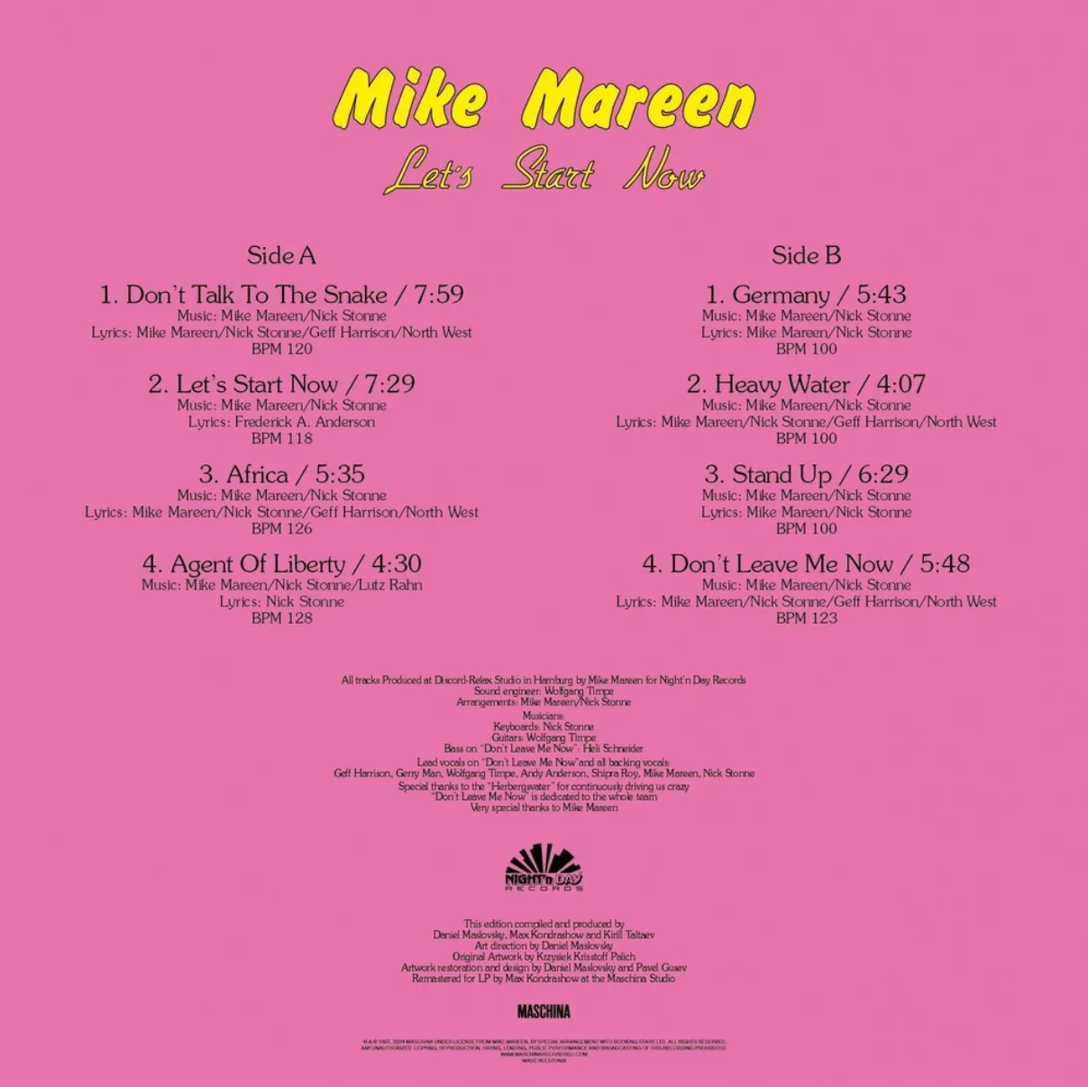 Описание Mike Mareen – Let's Start Now 1987 (2024) LPMike Mareen – Let's Start Now 1987 (2024) LP Maschina – LPMSCN301 Vinyl, LP, Album, Reissue Estonia НОВЫЙ, В УПАКОВКЕ ПРОИЗВОДИТЕЛЯ A1 Don't Talk To The Snake