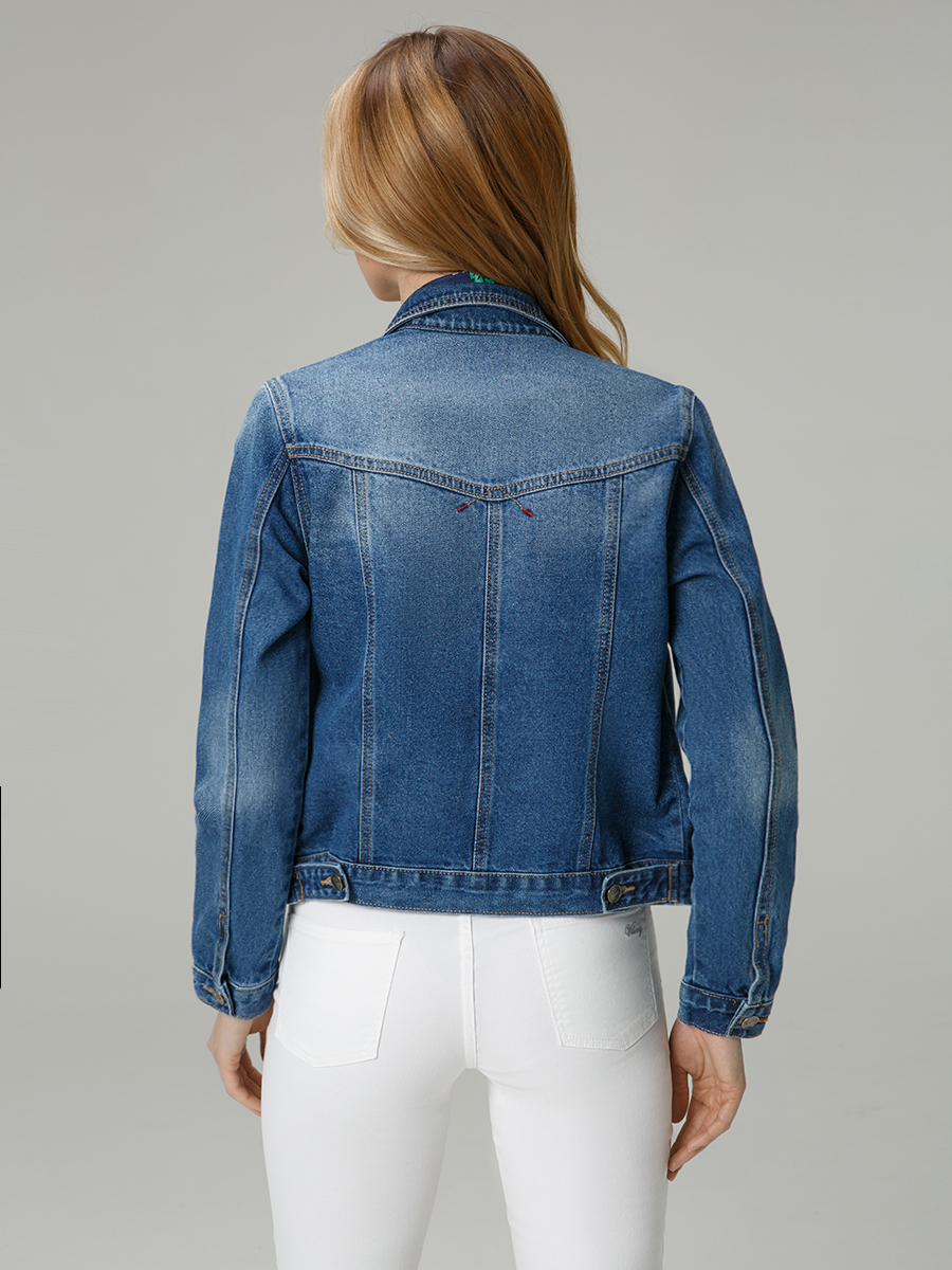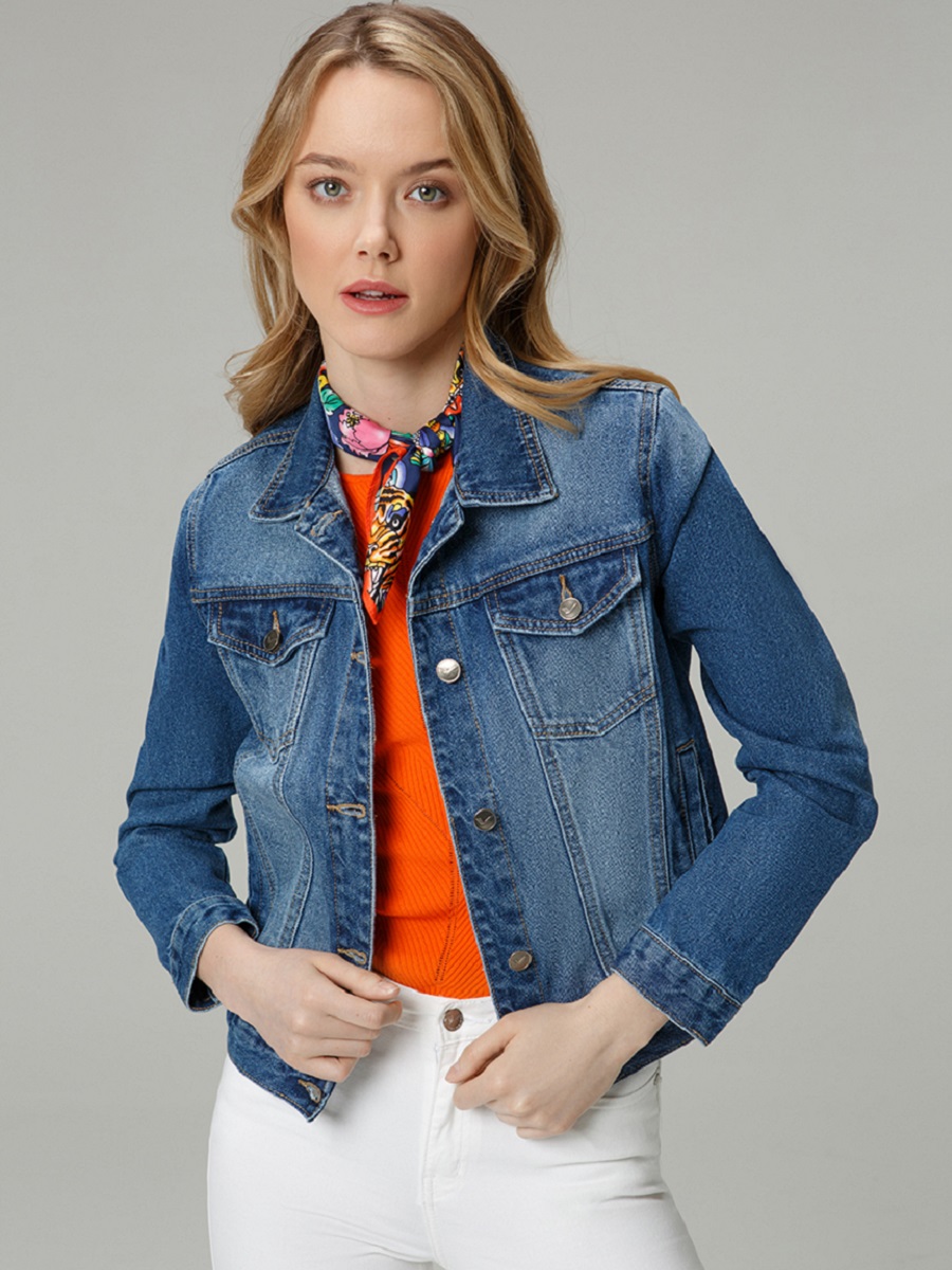 Женская джинсовая куртка из денима с застежкой на пуговицах-болтах.