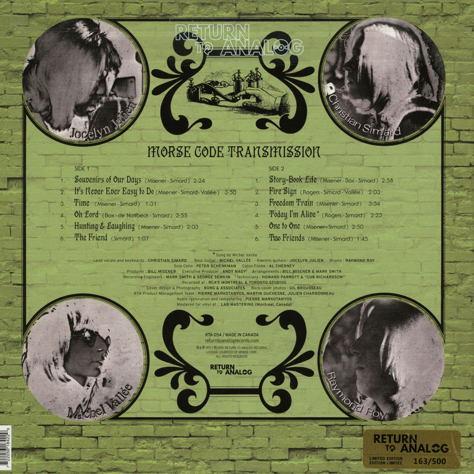 A2It's Never Easy To Do A3Time A4Oh Lord A5Hunting & Laughing A6The Friend B1Story-Book Life B2Fire Sign B3Freedom Train B4Today I'm Alive B5One To One B6Two Friends Эта группа из Квебека имела три воплощения. Первое воплощение — психоделический период, когда группа была известна как MORSE CODE TRANSMISSION и записала два психоделических альбома в 1971 и 1972 годах с вокалом на английском. Характеристики Morse Code Transmission - Morse Code Transmission 1971 (2019) LP
