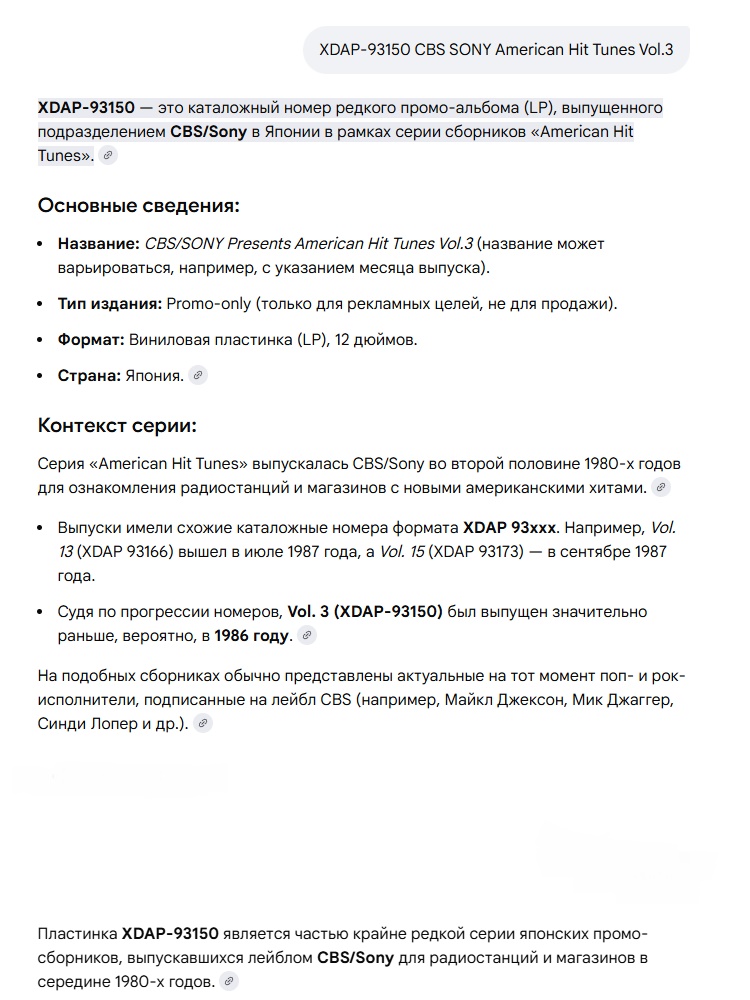 Японский образец виниловой пластинки (XDAP-93150) CBS SONY American Hit Tunes Vol.3 - август 1986 года. СОСТОЯНИЕ: конверт NM / винил Mint ЗВУК: 1 сторона Mint / 2 сторона Mint Промо версия, на Дискогсе нет. Пластинка в идеальном состоянии Mint. Отличный сборник, "проходных" песен нет. ![]()